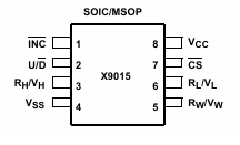 The Intersil X9015 is a 32 tap potentiometer that is volatile. The device consists of a string of 31 resistors that can be programmed to connect the RW/VW wiper output with any of the nodes between the connecting resistors. The connection point of the wiper is determined by information communicated to the device on the 3-wire port. The 3-wire port changes the tap position by a falling edge on the increment pin. The direction the wiper moves is determined by the state of the up/down pin. The wiper position at power up is Tap.